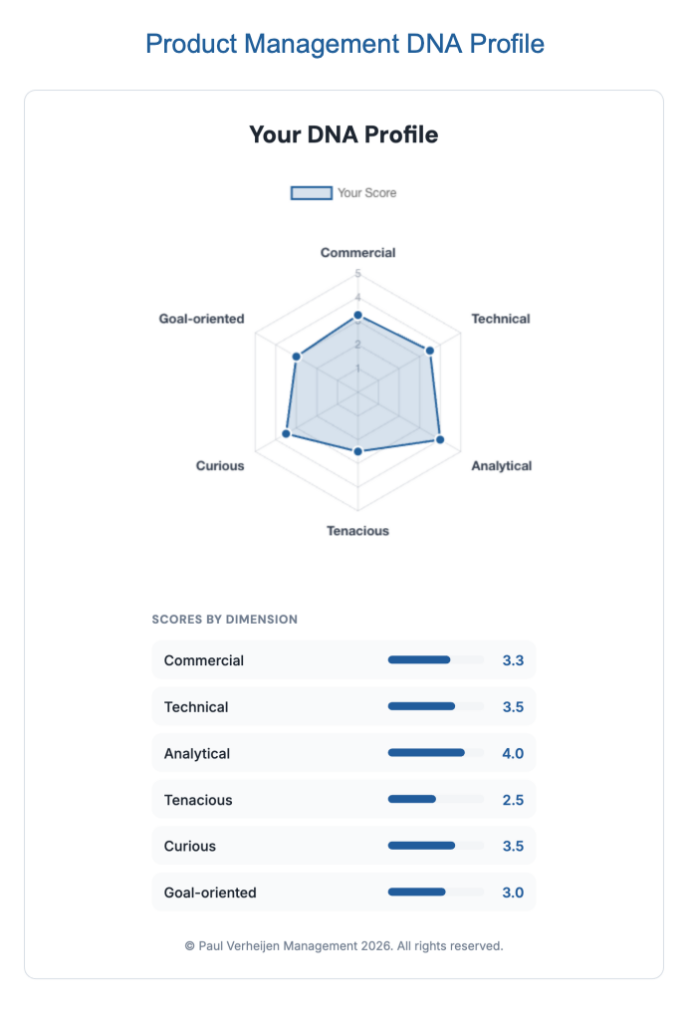 Every Product Manager brings a unique blend of strengths to their work, a personal “DNA” that shapes how they think, decide, collaborate, and create impact. The six dimensions in this model reflect the core capabilities that define modern product management: from strategic clarity to customer empathy, from architectural thinking to executional discipline.